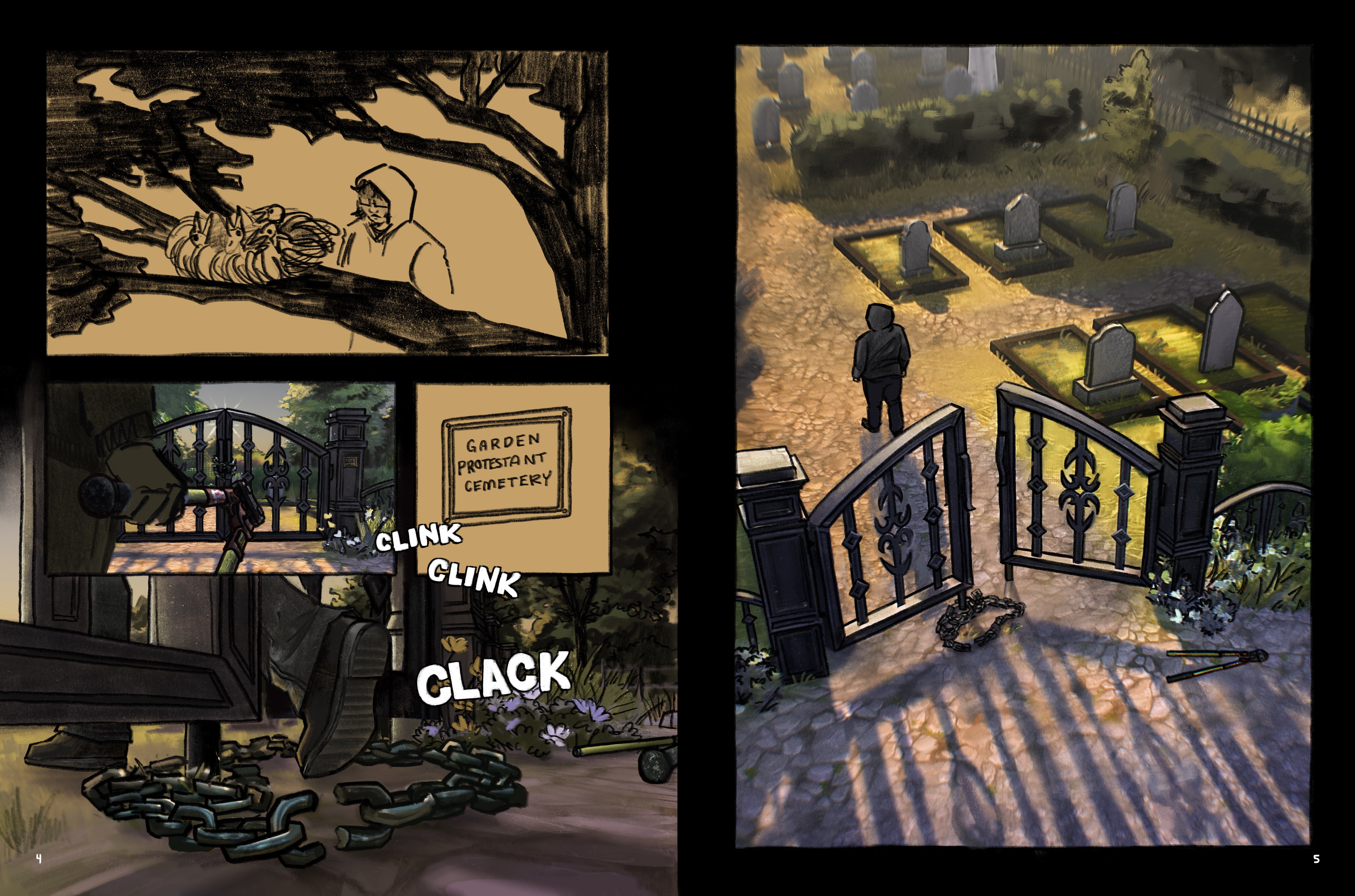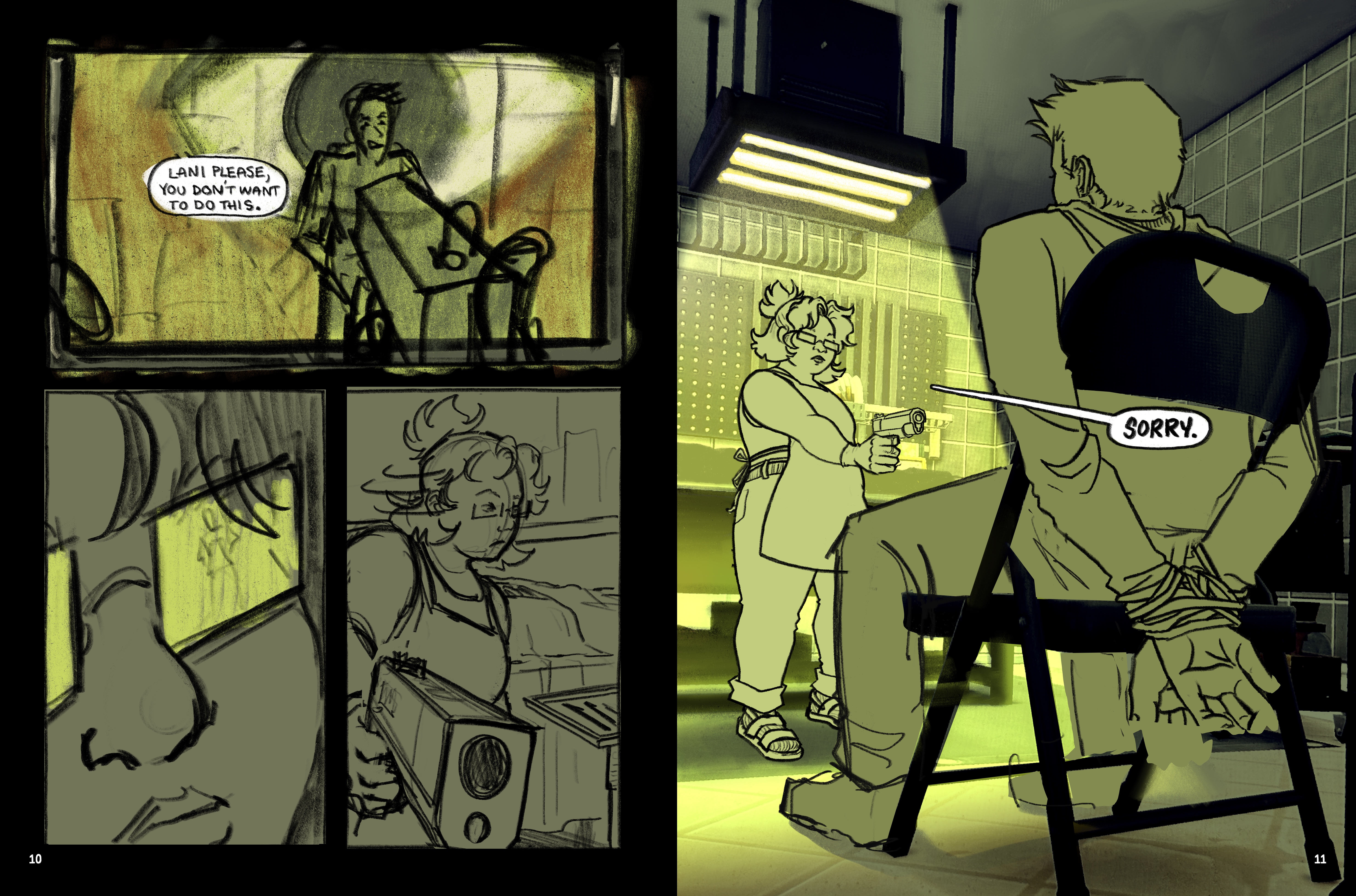 After Hours is a long-form graphic novel currently in production. Public excerpts are limited, but I share pages with editors, collaborators, and interested contacts upon request.