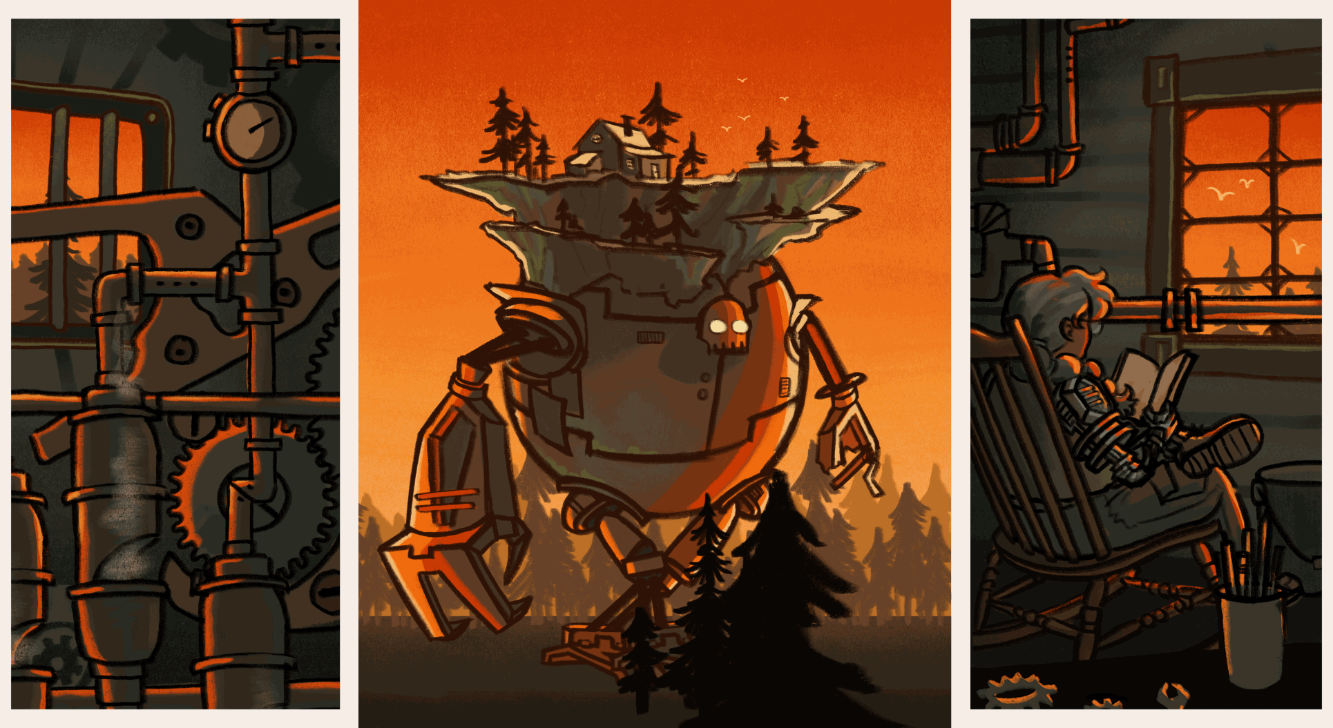 Illustrated GIF triptych set in a post-steampunk world.